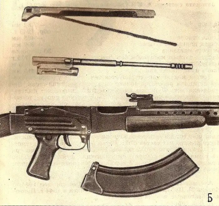 Автомат системы А. И. Судаева – опытный образец 1944 года (Модель 1), вид справа. В – части автомата, Г – части затвора Источник: Экспозиция Военно-исторического музея артиллерии, инженерных войск и войск связи «Оружие победы. Коллекция стрелкового оружия системы Судаева в собрании музея»