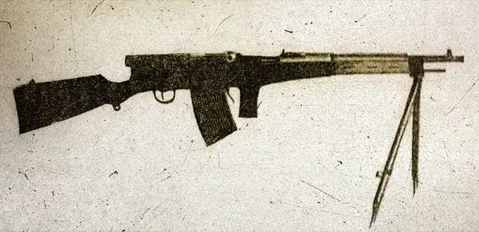 Автомат системы А. И. Судаева (заводской номер – ЮЕ 328). Опытный образец 1944 года. Вид слева (сошки сложены).