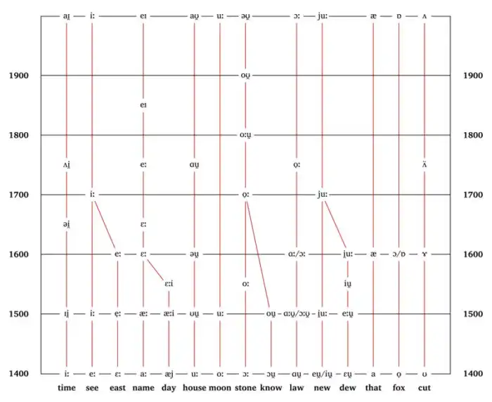 Изучающим английский язык непросто привыкнуть к тому, что большинство слов читаются не так, как пишутся. Во многом эта разница объясняется так называемым великим сдвигом гласных, происходившим в XIV—XVI веках, когда многие гласные звуки постепенно изменялись в речи англичан. Великий сдвиг гласных — историческое событие, отделяющее два этих языка друг от друга. До сдвига произношение гласных было сходно с произношением в латинском языке, а фонетика самого языка была схожа с нидерландской или нижненемецкой. После великого сдвига два долгих гласных стали дифтонгами, а другие пять стали звучать иначе. Например, слово «time» до сдвига читалось как «тим», а сейчас — «тайм», а «moon» эволюционировало из «моон» в «мун». Путаница усугубляется тем, что один звук в некоторых словах изменился, а в других остался прежним — можно сравнить «bear» и «meat». В это же время распространились печатные станки, благодаря которым укоренилось принятое в тот момент написание, поэтому речевые изменения не сумели повлиять на текст.