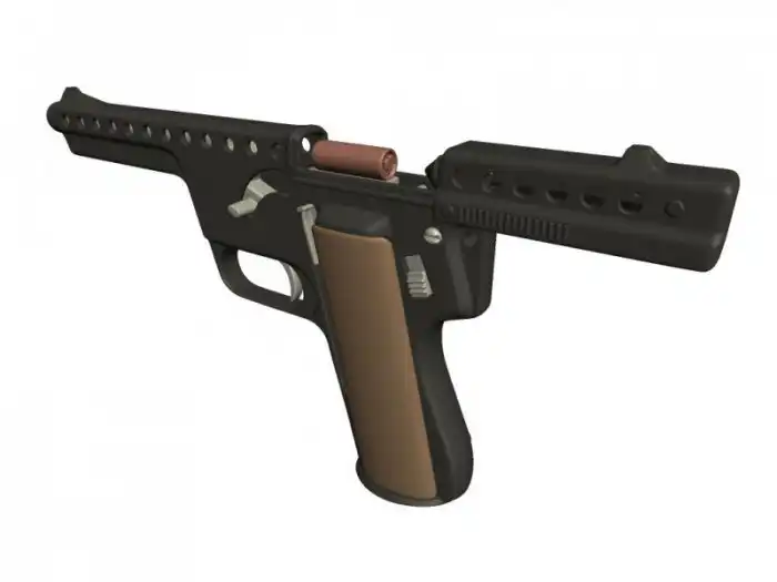 Главное ноу-хау, на котором базировалась вся система, крылось в пуле. На вид это был обычный пистолетный патрон, пусть даже и нестандартных размеров: 13х50 мм. Внутри его, как это бывает, был пороховой заряд. Однако вопреки устоям пуля и «гильза» нового патрона были выполнены в виде одной детали, а в донце «гильзы» имелось четыре наклонных отверстия. Внутренность была заполнена ракетным порохом. Из конструкции боеприпаса можно сделать вывод о принципе работы. При накалывании капсюля (в центре донца «гильзы») воспламенялся порох, который сгорал в течении 0,1 секунды и, истекая через наклонные отверстия, разгонял пулю и придавал ей вращение. Преимущества были налицо: пуля покидает оружие, не оставляя в нем каких-либо составных частей патрона, и, как следствие, позволяет значительно упростить конструкцию оружия. Да и стоимость пистолета или ружья будет значительно ниже.