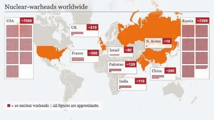 По подсчетам специалистов, на Земле сегодня хранится более 15 тысяч ядерных зарядов. Россия владеет примерно 7300 ядерными бомбами, в США их насчитывается 6970, во Франции - около 300, в Китае - 260, в Великобритании - 215, в Индии и Пакистане - по 120, в Северной Корее - около десятка, в Израиле, по неофициальным данным - порядка 80.