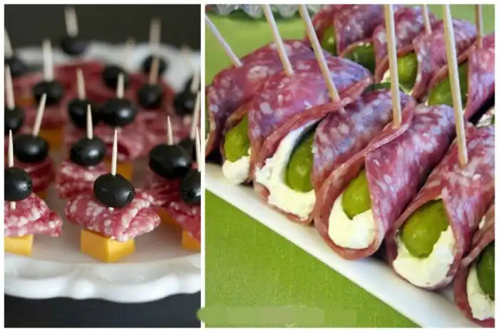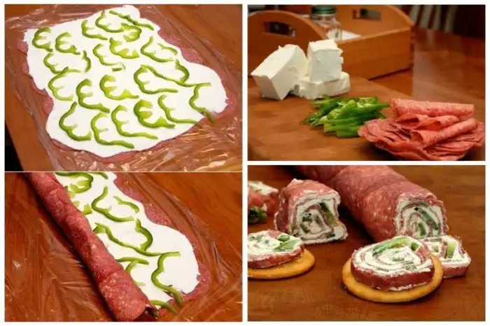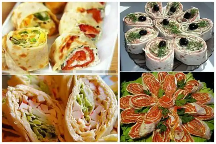 Нет лаваша? Ну не беда. Колбаска кружочками, мягкий сыр и зубочистка (шпажка) - красота!