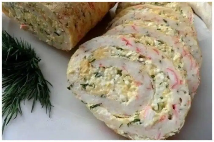Трем в миску 200 грамм твердого сыра, 200 грамм крабовых палочек, добавляем 5 яиц, 150 грамм майонеза, 5 столовых ложек муки, каплю молока, чтобы получилась консистенция густой сметаны. На противен выложите рукав для запекания (разрежьте его, чтобы свешивалось по краям), смажьте растительным маслом - вылейте на него смесь и в духовку на 5-10 минут (следите, готовится очень быстро, пойдут сверху пузыри, доставайте). Пока делается основа, включите фантазию - внутрь можете положить что угодно - сыр, перетертый с чесноком, фарш с зеленью, вареные яйца, маслины и т.д. Достаете вашу массу, выкладываете сверху "замазку" и сворачиваете рулет. Оставляете до полного остывания. Если кладете фарш, то поставьте в духовку еще минут на 10.