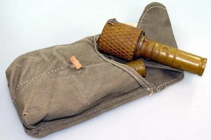 Сумка гранатная. Каждый пехотинец имел при себе ручные гранаты, которые штатно переносились в специальной сумке на поясном ремне. Располагалась сумка слева сзади, после патронной сумки и перед продуктовой. Представляла собой четырёхугольную тканевую сумку с тремя отделениями. В два больших укладывались гранаты, в третье, малое – детонаторы для них. В боевое положение гранаты приводились непосредственно перед применением. Материалом сумки могли быть брезент, парусина или палаточная ткань. Закрывалась сумка на пуговицу или деревянную бобышку-клеванту.