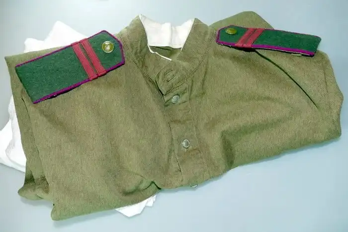 Солдатская гимнастёрка образца 1943 года. Была введена приказом Народного комиссара обороны СССР от 15 января 1943 года взамен гимнастёрки образца 1935 года. Главные отличия заключались в мягком стоячем воротнике вместо отложного. Застёгивался воротник на две форменные пуговицы малого размера. Передняя планка была открытая и застёгивалась на три пуговицы через сквозные петли.