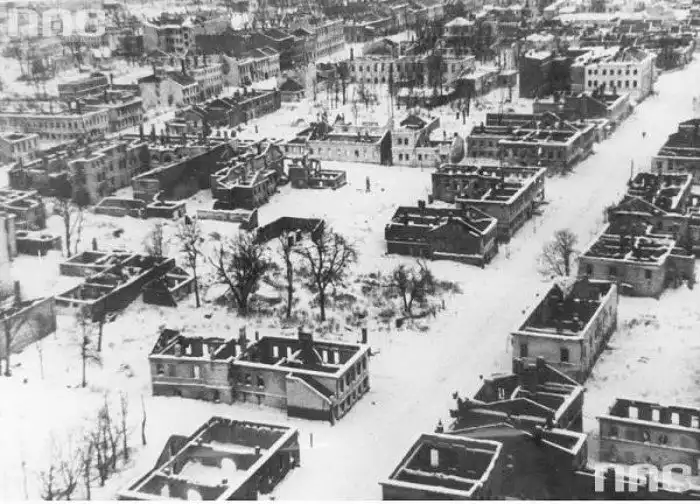 Советские войска, освободив 20 января 1944 г. Великий Новгород, нашли город полностью разрушенным и безлюдным. Из 2500 жилых домов уцелели только 40. Были уничтожены или сильно пострадали почти все памятки архитектуры, в том числе Софийский собор, а также памятник "Тысячелетие России". К моменту освобождения в городе осталось только 30 жителей — остальные были либо угнаны в Германию, либо были убиты оккупационными войсками.