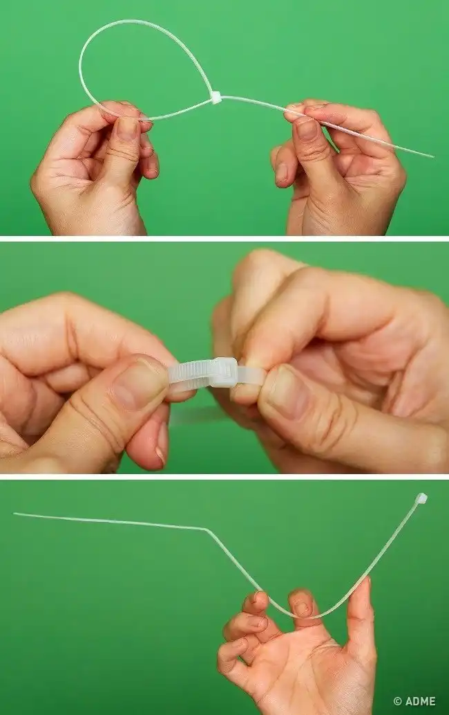 Когда нам встречаются подобные пластиковые стяжки, мы привыкли сразу же разрезать их ножом или ножницами. Оказывается, нужно всего лишь отодвинуть язычок и вытянуть стяжку из замка.