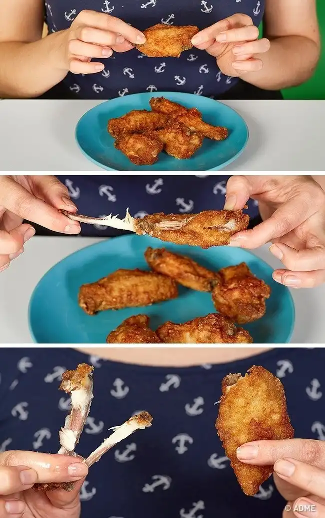 Чтобы съесть куриные крылья и не запачкать все вокруг, придерживайтесь следующей инструкции. Отломите небольшой кусочек крыла, где виднеется маленькая косточка, а потом покрутите и потяните за нее — она легко выйдет. Затем снова немного покрутите и вытащите большую косточку. Вот и все махинации — курица готова к употреблению.