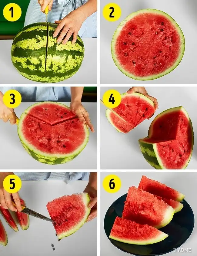 Здесь тоже все просто: для начала разрежьте арбуз поперек пополам. Вы увидите, что косточки растут в арбузе рядами. Нужно нарезать ломтики прямо по косточкам, но так, чтобы они оставались чуть снаружи. Затем их останется только аккуратно соскрести ножом.