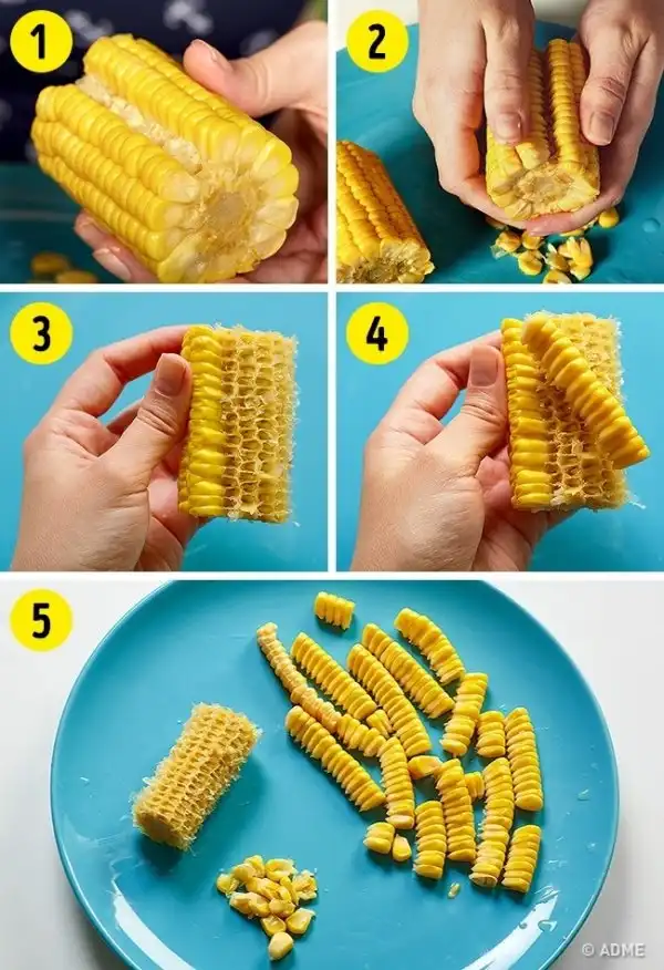 Метод прост до безобразия: для начала порежьте початок вареной кукурузы на несколько небольших частей. Затем удалите один ряд зерен, возьмите початок в руки, прижмите большой палец к соседнему пустому ряду и надавите. Так можно есть целый ряд кукурузинок один за одним, к тому же початок останется совершенно чистым.