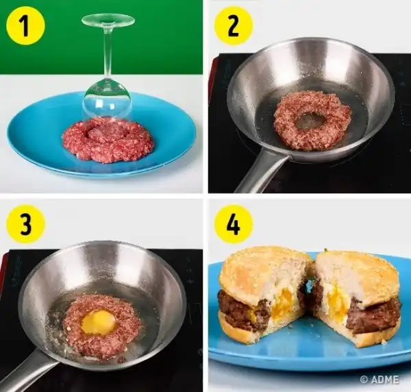 Самые вкусные котлеты получаются, если добавить в серединку какую-нибудь начинку, например яйцо. Выложите фарш в форме колечка на сковороду, добавьте яйцо и поджарьте с двух сторон. Получившаяся котлета станет вкусной и питательной основой для бургера.