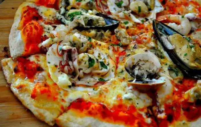 Инструкция: Тщательно вымыть щеткой моллюски и мидии. Поместить их в кастрюлю, залить вином и поставить на сильный огонь, часто встряхивая кастрюлю, пока все раковины не раскроются. Отставить в сторону, чтобы содержимое остыло. Вынуть остывшие моллюски из раковин, отстранив нераскрывшиеся. Слить жидкость. На присыпанной мукой доске раскатать тесто в большую круглую лепешку. Выложить на противень. Вылить томатный соус на середину пиццы и распределить по всей поверхности с помощью обратной стороны ложки. Разложить сверху лук, а на него - моллюски. Посыпать сверху чесноком, майораном, солью и перцем, а затем пармезаном. Выпекать в нагретой до 220 градусов духовке примерно 15-25 минут в зависимости от толщины теста. Подать немедленно.