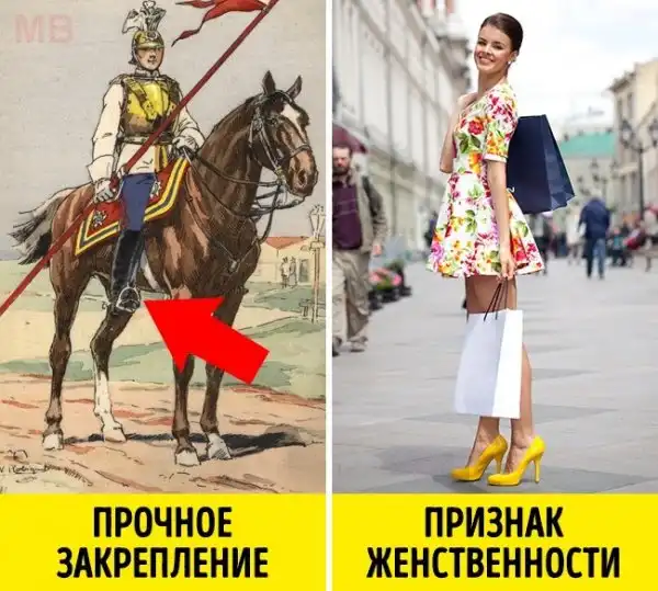 Многим уже известно, что на самом деле давным-давно каблуки носили мужчины, а не женщины. Но мало кто знает, что и они это делали вовсе не из-за моды. Первыми «испытателями» каблуков стали офицеры: каблук хорошо крепился в стремени при верховой езде. А далее мода перешла из военной сферы в светскую.