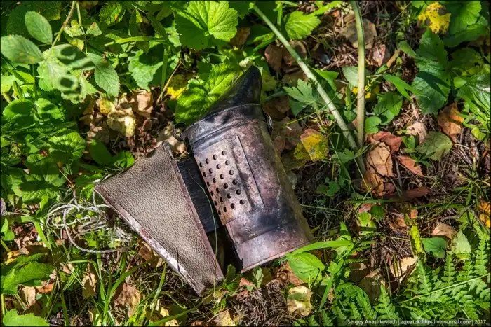 Окуриватель пчел. Выдувая дым, бортевик отгоняет пчел от гнезда, чтобы они не жалили его и не мешали работе.