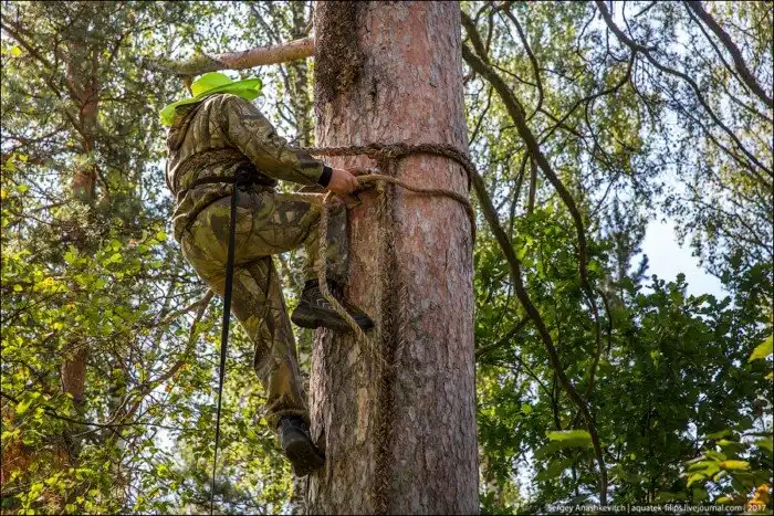 Это «лянге» — переносная платформа — подставка для ног, закрепляемая на стволе веревкой. На ней бортевик стоит, работая на дереве.