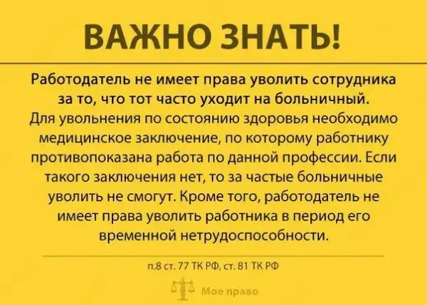 Некоторые работодатели задаются вопросом: в каком случае можно уволить сотрудника во время его пребывания на больничном? Закон на стороне работника. 81-я статья Трудового Кодекса РФ дает ясный и однозначный ответ: ни в каком. У организации нет законного права уволить работника, пока тот болеет. Здесь та же ситуация, что и с отпуском. Рассмотрим некоторые статьи ТК РФ.