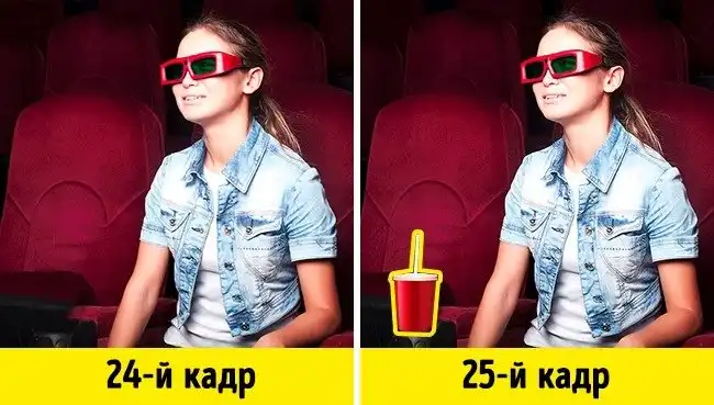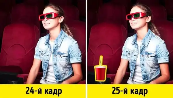 В 1957 году американец Джеймс Викари провел эксперимент: он вставил в обычный фильм кадры, призывающие пить определенный напиток и есть попкорн. По его утверждению, сразу после сеансов продажи и того и другого резко увеличились. Но год спустя Американская психологическая ассоциация опровергла эффект 25-го кадра, а в 1962 году и сам Викари признался в фальсификации результатов эксперимента.