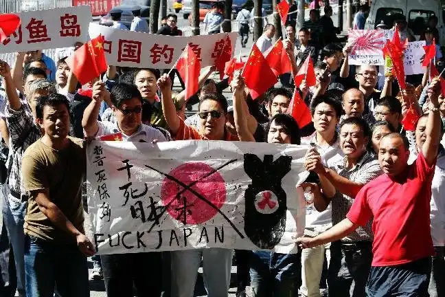 Несут плакат "Япония произошла от Китая!" Не шутка.
