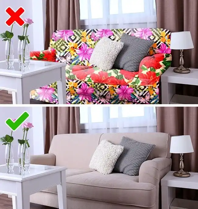 Диван с пестрой расцветкой может хорошо смотреться в магазине, но гармонично вписать его в интерьер довольно трудно. Лучше отдать предпочтение однотонной мебели. А если захотелось разнообразия, на помощь придут цветные подушки и уютные пледы — можно менять их хоть каждый день, под настроение.