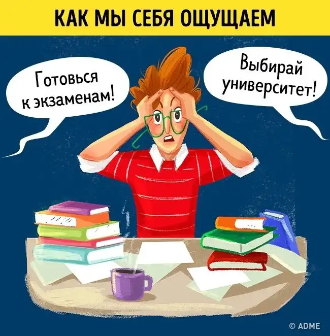 Прежде всего, будем откровенны: в состоянии предэкзаменационного стресса и подготовки ко вступительным испытаниям невозможно принять взвешенное решение. Единственное, чем действительно стоит заняться, так это узнать себя вне рамок регламента и планов. Нужно задать себе пару вопросов: