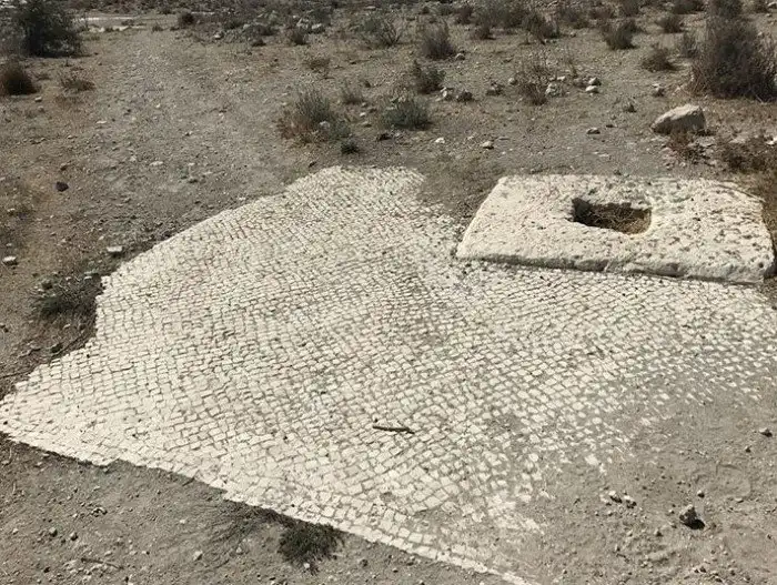 "Классная находка. Большая часть, что ближе к нам - это напольная мозаика. Квадратный камень с дыркой - основание колонны. Постройка относится примерно к 100 г. до н. э. - 7 в. н. э.".