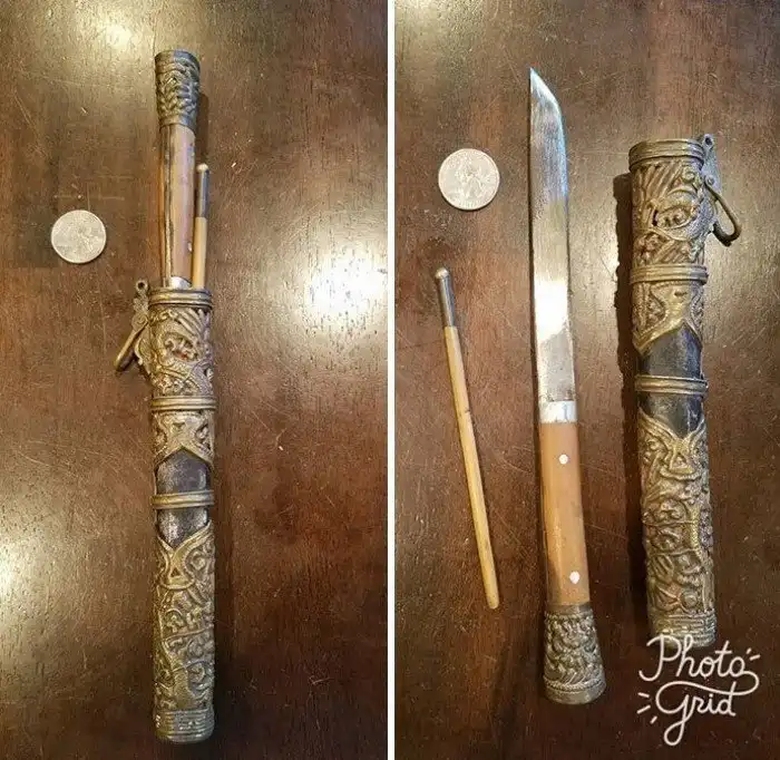 "Во времена правления китайского императора Цяньлуна (1736-1796) ношение таких ножей было обязательным для всех маньчжуров и монголов. Нож (еще в комплекте две палочки) предназначены для поедания мяса. Они ели его не откусывая, а отрезая ножом".