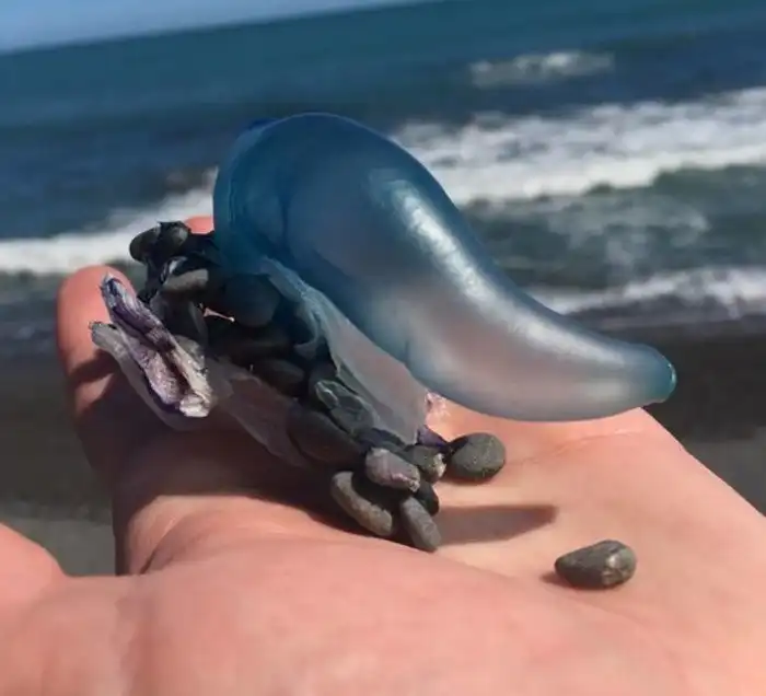 "Это часть сифонофоры - свободноплавающего морского животного. Воздушный пузырь служит им в качестве паруса. Не трогайте их! Они могут серьезно ужалить (как медузы)".
