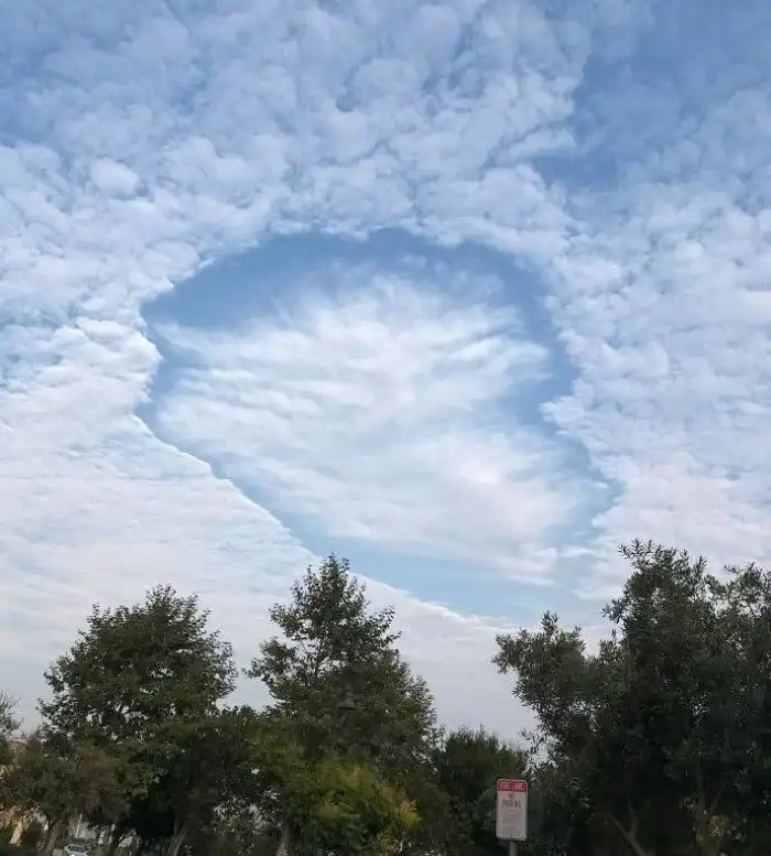 "Явление называется fallstreak hole (в русском - "дырообразная полоса выпадения (осадков)"). Образуется в области перисто-кучевых облаков тогда, когда жидкость находится в переохлажденном виде. Может быть вызвано, например, пролетающим сквозь облака самолетом".