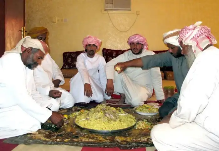 Рис оманец зачастую берет руками, скатывает из него шарик и, прихватив вместе с ним мясо, рыбу или овощи, отправляет в рот. Дань традициям… Руки моют до и после еды, на столах всегда присутствуют салфетки. Сама кухня в Омане представляет собой смесь арабских и индийских традиций. Порции огромные, как, впрочем, везде в арабских странах. И конечно, главный напиток — кофе, очень крепкий и вкусный. Его подают в кофейнике, пьют из крошечных чашек и обязательно с финиками.