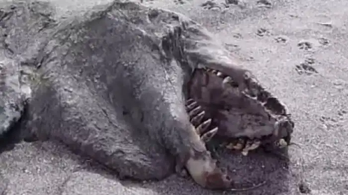 Когда в 2013 году нечто было выброшено на берег одного новозеландского пляжа, местные жители начали паниковать, думая, что они наткнулись на доисторическое морское существо. Нечто было похоже на большой кусок чьей-то плоти с огромными зубами. Изуродованное и разлагающееся существо было 914,4 сантиметров в длину, а задняя его часть просто утопала в песке. Показывая набор острых и ужасающих зубов, существо выглядело так, как будто оно вышло прямо из Парка Юрского периода. Однако, хотя некоторые люди утверждали, что так оно и есть, ученые быстро смогли их успокоить, утверждая, что мертвый «динозавр», скорее всего, был мертвым китом, о чем свидетельствовал плавник с правой стороны.