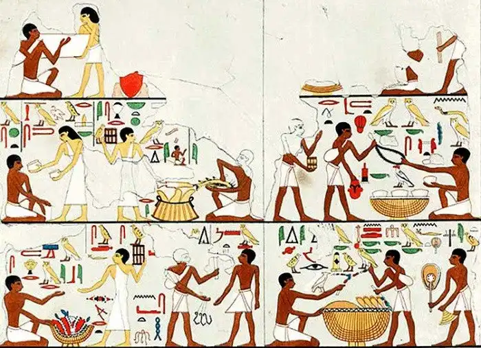 О кулинарных рецептах древних египтян, вероятно, уже никто и никогда не узнает. Не было найдено никаких записей, но узнать о том, чем питались египтяне, можно из произведений искусства того времени. Некоторые ингредиенты употреблялись всеми классами, но ряд продуктов простолюдинам был запрещены. К примеру, копчение рыбы было строго уделом жрецов. Зато ежедневной пищей всех слоёв общества было пиво и хлеб.