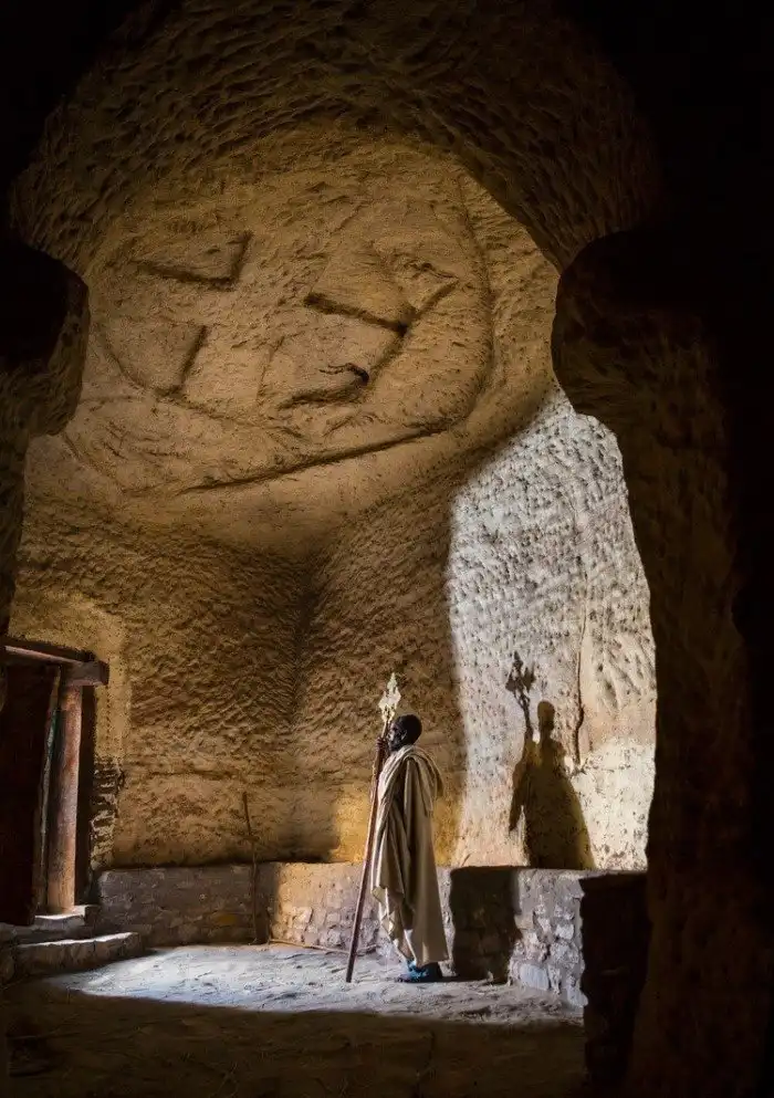 Дэбрэ-Дамо стоит на горе с плоской вершиной на севере Эфиопии и выступает одним из важнейших центров христианства в стране. Эта маленькая современная церковь построена перед гротом, где, как говорят, исчез Арагави – один из девяти святых (или миссионеров), принесших христианство в Эфиопию. Святым часто приписывали исчезновение, а не смерть. Выступающие из саванов скелетные останки монахов можно увидеть в нишах в стенах грота.