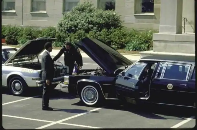 7. Полицейский «прикуривает» свой патрульный автомобиль от лимузина президента США Рональда Рейгана.