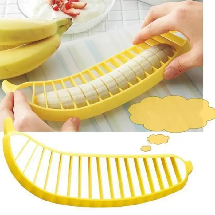 Вообще, сложно представить ситуацию, в которой под рукой не окажется ножа, зато будет проволочный лоток… Ну хорошо, предположим, что так. С незрелым бананом такая хитрость может и пройдет, но, если фрукт спелый — он мягкий, а значит в попытке разрезать его, скорее всего, получится фруктовое пюре.