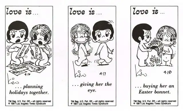 Роберто решил продюсировать выход комиксов, и так «Love is» увидели свет 5 января 1970 года. В комиксе 1974 года мальчик называет девочку Ким, а раньше, в комиксе 1971 года, девочка чертит на песке букву R — первую букву имени Роберто.