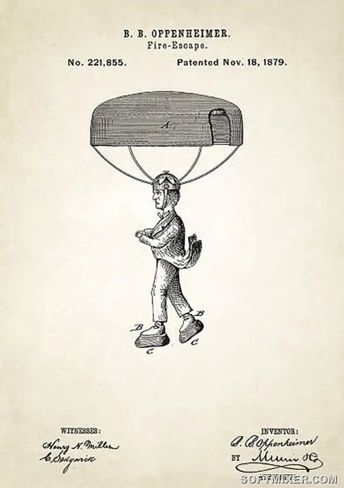 Что делать, если здание горит? Правильно, сигать в окно. Для того, чтобы падать было не так жестко господин Оппенгеймер придумал парашют. Ну, сама идея парашюта витала в воздухе еще со времен Леонардо Да Винчи, а вот прикрепить его к голове додумались впервые.