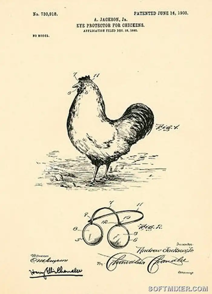 Изобретатель был обеспокоен тем, что курицы периодически выклевывают друг другу глаза. Он придумал защитные очки, которые надеваются на каждую наседку. То есть особо агрессивным курицам пришлось бы сначала стащить с противника защиту, а за это время несчастная упела бы позвать на помощь.