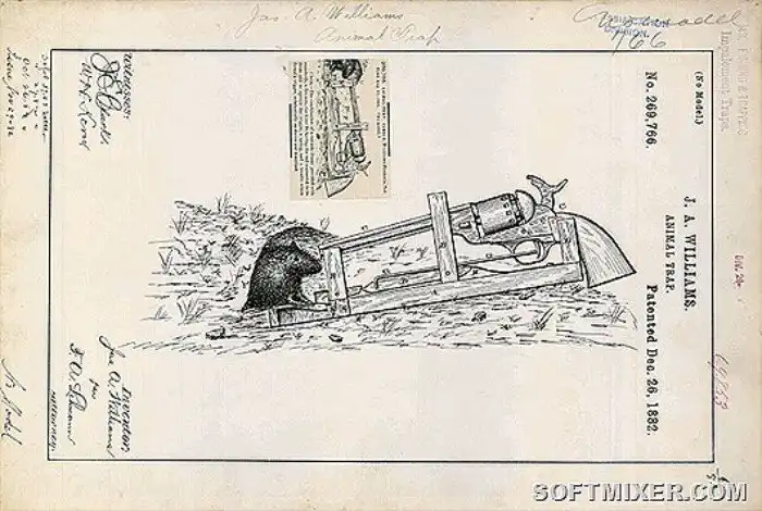 Настоящие мужчины убивают врага из револьвера. Видимо таким был изобретатель по фамилии Уильямс, который запатентовал самую суровую мышеловку в мире. Мышь подходит в надежде полакомиться сыром или печенькой и получает в лоб девять грамм свинца. Достойная смерть.