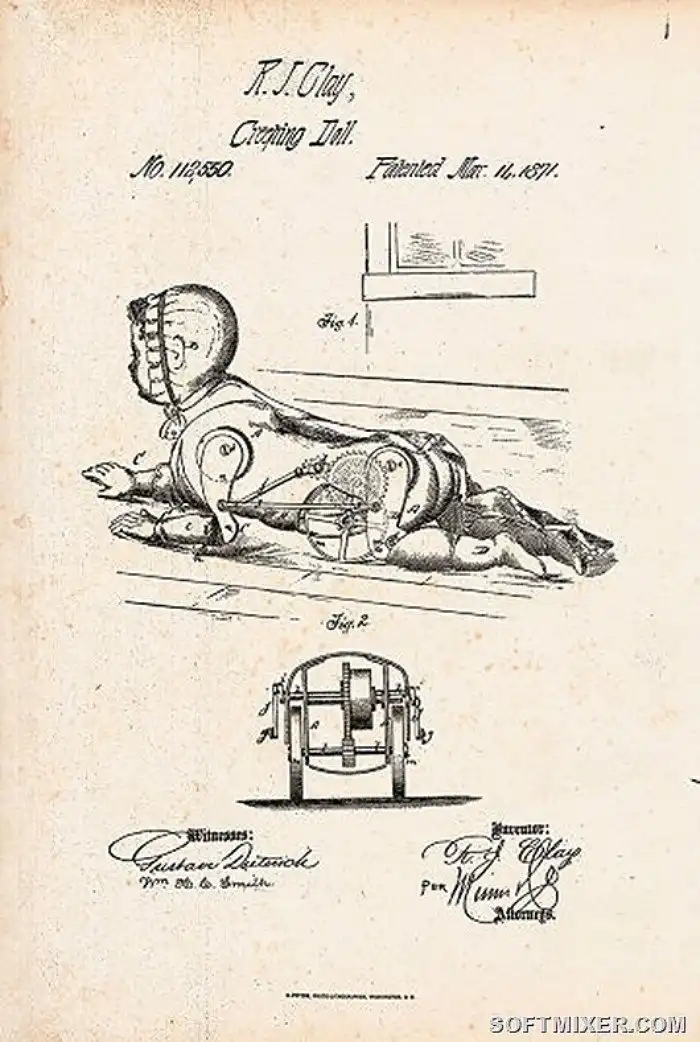 Роберт Клей получил патент на такого заводного, ползучего ребенка. Он движется по полу на колесах, а руки и ноги имитируют движения настоящего малыша.