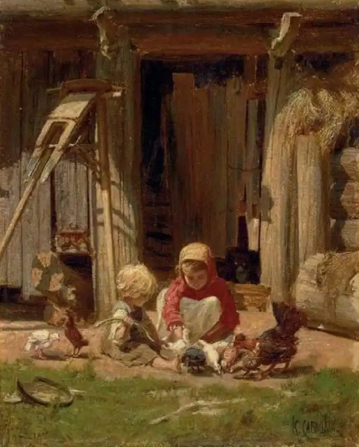 Дети кормят цыплят у хлева. Автор: Георгий Савицкий.