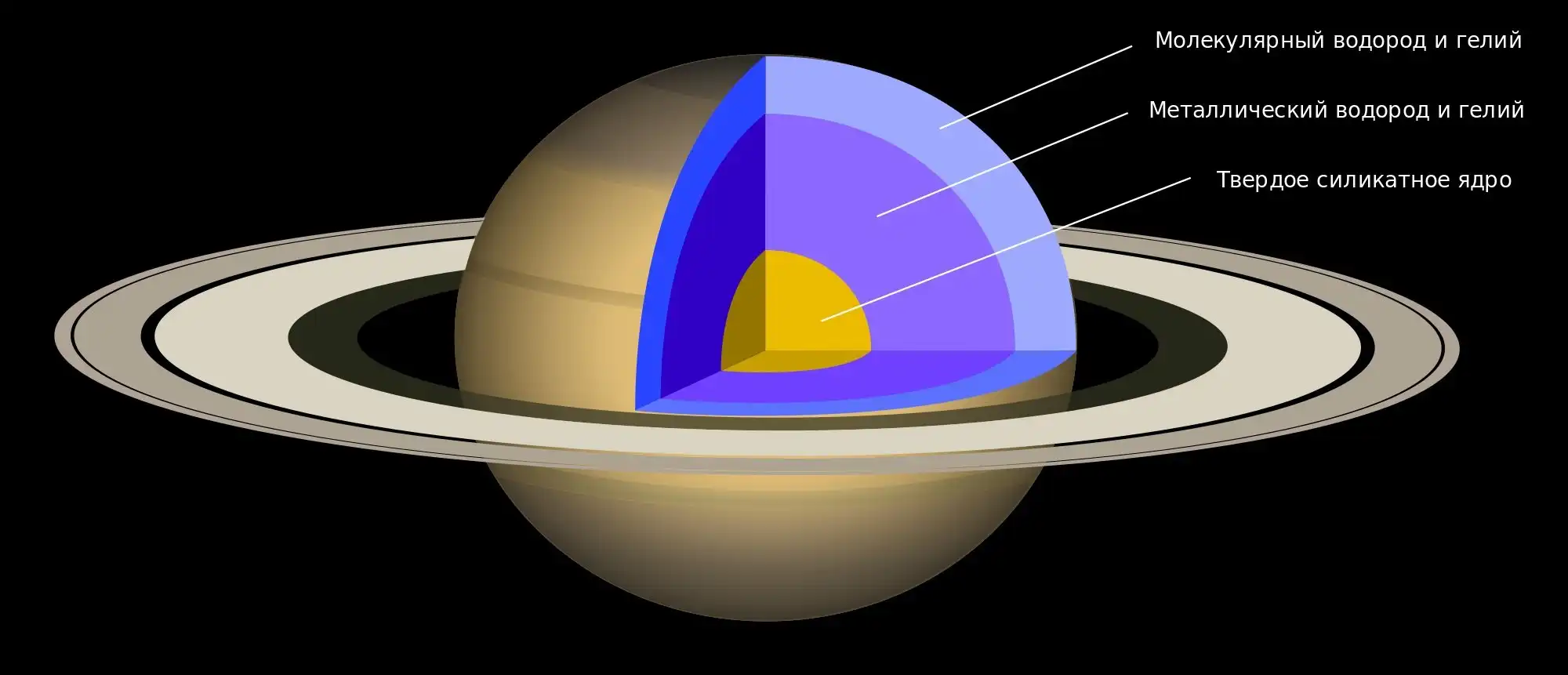 Несмотря на все внешние различия, отсутствие знаменитого Красного пятна и наличие еще более знаменитых колец, Сатурн очень похож на соседний Юпитер. Он состоит из водорода на 75%, и на 25% из гелия, со следовым количеством воды, метана, аммиака и твердых веществ, в основном сосредоточенных в горячем ядре. Как и на Юпитере, здесь имеется толстый слой металлического водорода, создающий мощное магнитное поле.