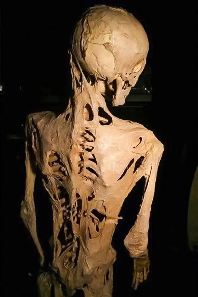 Это редкое и тяжелое генетическое заболевание характеризуется постепенной оссификацией (окостенением) мышц, сухожилий и связок. Как видно на фотографии скелета, принадлежавшего больному фибродисплазией, человек буквально «зарастает» костной тканью. Болезнь приводит к тяжелым деформациям, утрате возможности нормально передвигаться и преждевременной смерти.