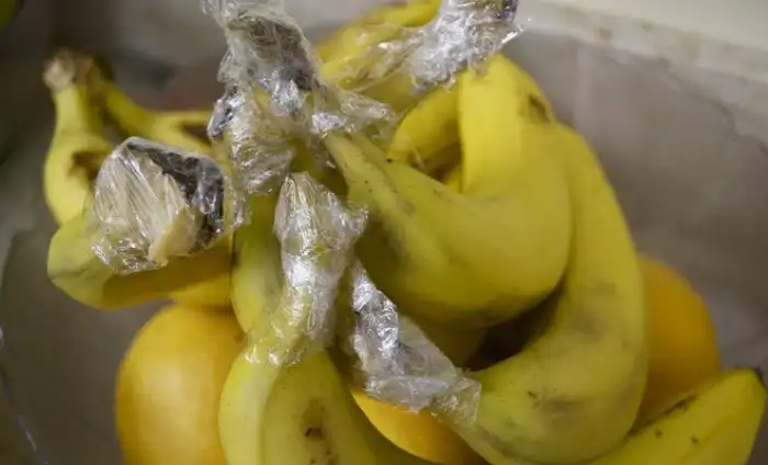 Бананы пропадают чаще прочих продуктов, поскольку обычно покупают их больше, чем можно съесть. Заверните основание грозди в пищевую пленку и не беспокойтесь о том, что бананы почернеют. Пищевая пленка поможет сохранить им необходимую влагу.