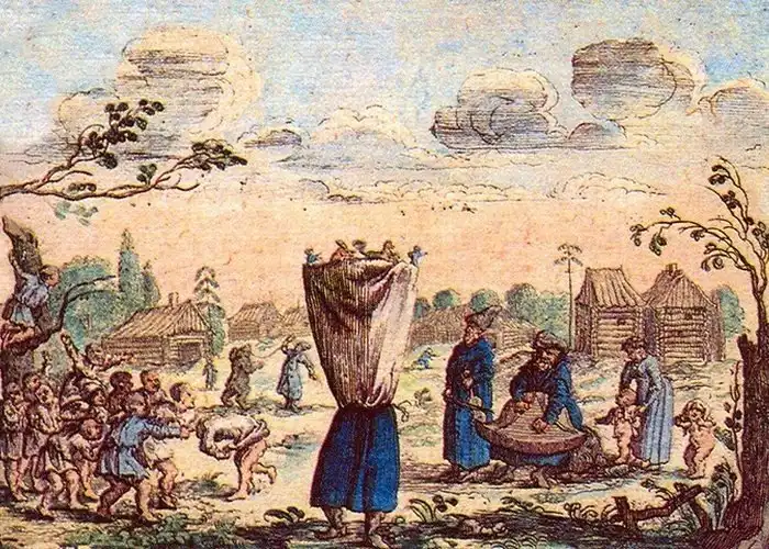 Необычайный маскарад символизировал единение с духами, перевоплощение и в то же время закрывал ряженого от действия злых сил – они не могли узнать его под чужой личиной. Покровителем скоморохов считался славянский бог Троян, всячески помогавший комедиантам.