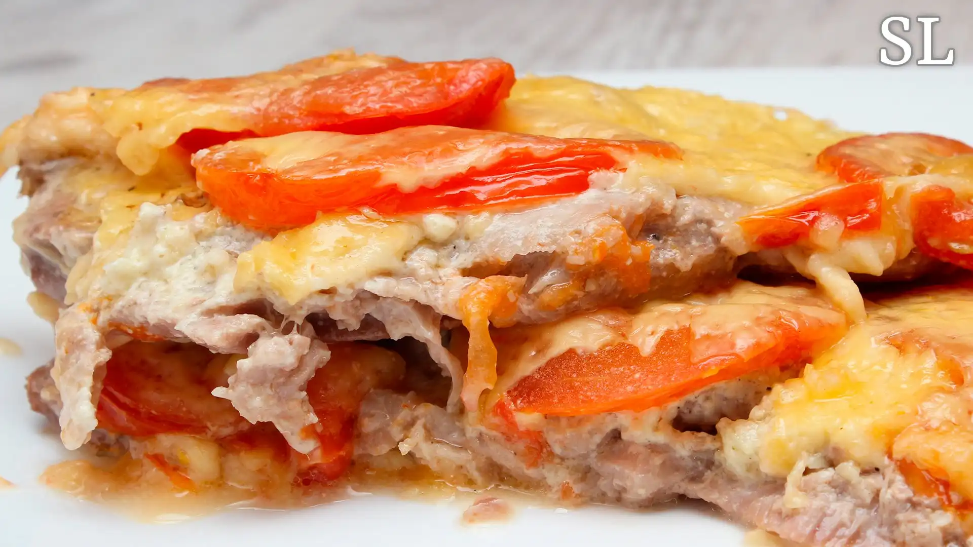 Противень или любую другу жаропрочную форму смажьте растительным маслом и выложите отбитое мясо немного внахлест. Мясо хорошо посолите и поперчите, смажьте соусом. Сверху выложите кружочки помидоров и щедро засыпьте все тертым сыром.