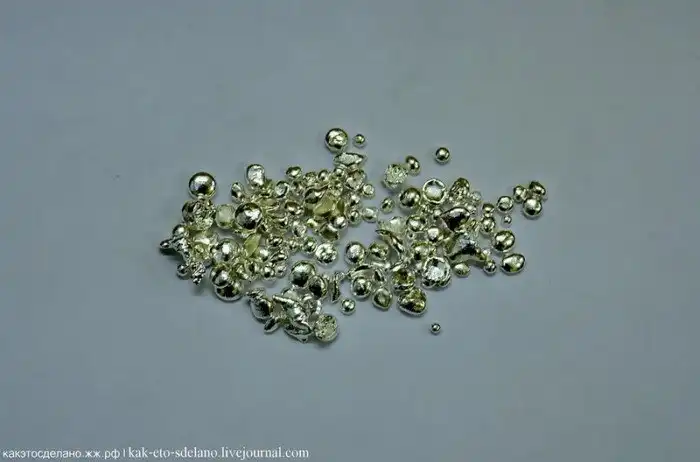 Это серебро. На производство оно обычно попадает в слитках, как и золото, а в виде таких гранул драгоценный металл приходит с аффинажного завода после вторичной переработки, как и золото, кстати. Медь поступает на завод в виде проволоки.