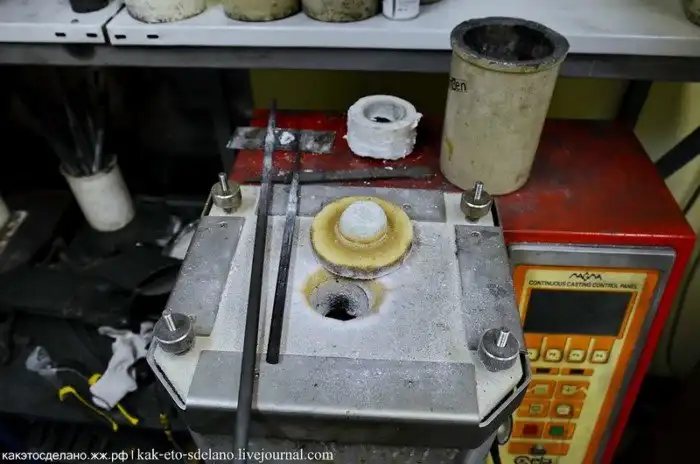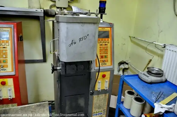 В следующем цехе в печах непрерывного литья делают золото двух проб. На фото видно эту самую печь. Драгоценный металл в нем расплавляют с помощью индуктивного нагрева током высокой частоты.