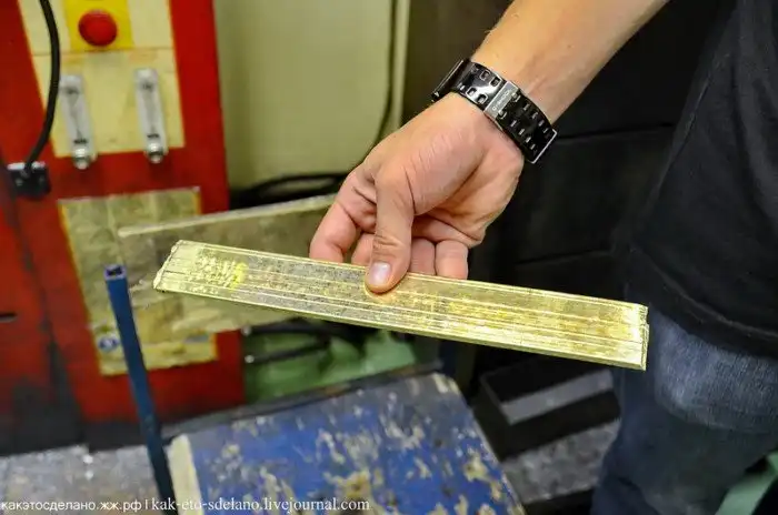 Из аналогичного бруска золота длиной 12 см. и толщиной 5мм. получают ленту длиной до 2.5 метров и толщиной 0.25 мм. Для этого брусок должен пройти через валы прокатного стана более 50 раз