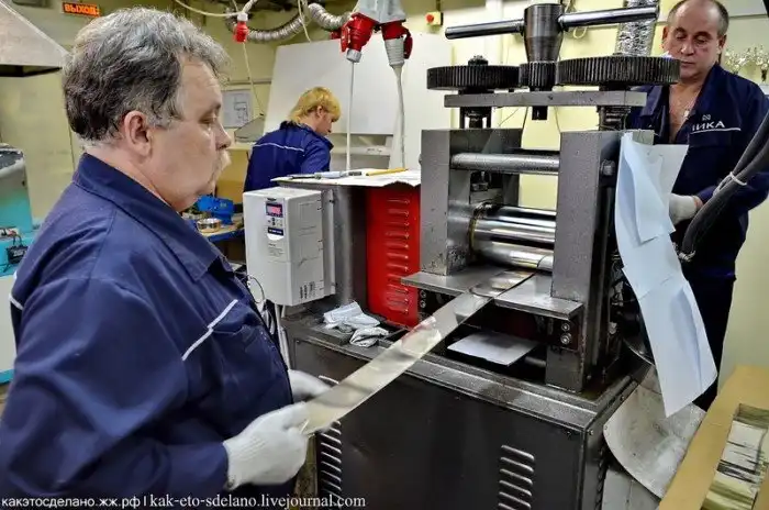 Серебряные и золотые слитки перед попаданием в тигель проходят через такие прокатные станы, чтобы превратить их в ленты, которые легко нарезать на куски перед помещением в графитовые горшки.