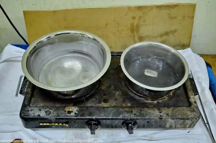 Здесь в кастрюле с лимонной кислотой варится серебряный брусок, который остался в тигле. Это делается для того, чтобы очистить его от шлака и опять бросить в переплавку.